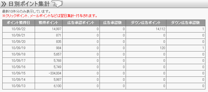 今まで1日に55円前後あった報酬額が、クリック広告特集が終了して1日9円弱まで下落。