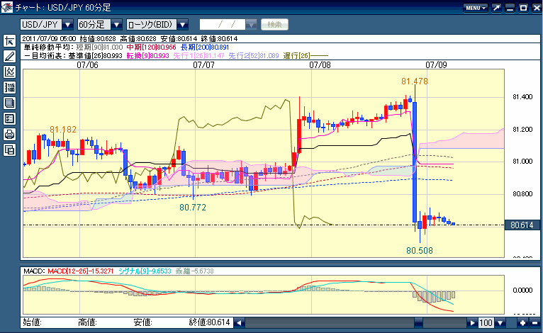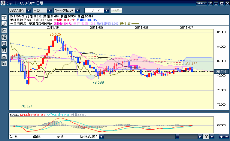 下値はサポートされてるように思えるけど、MACDや遅行線が微妙な位置だな。雲も厚い。