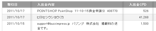 | 以下の内容でポイント交換を受け付けましたのでお知らせします。 ■交換ポイント数 : 500ポイント ■振込予定金額 : 510円 ■交換日 : 2011/09/20(火)21:38 |